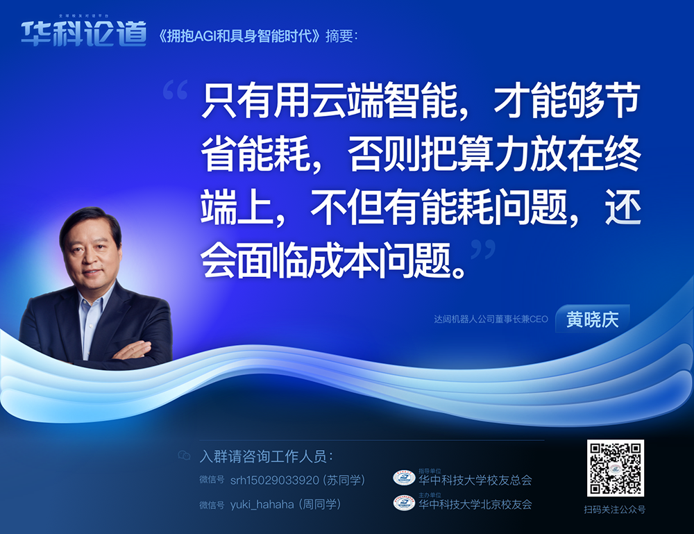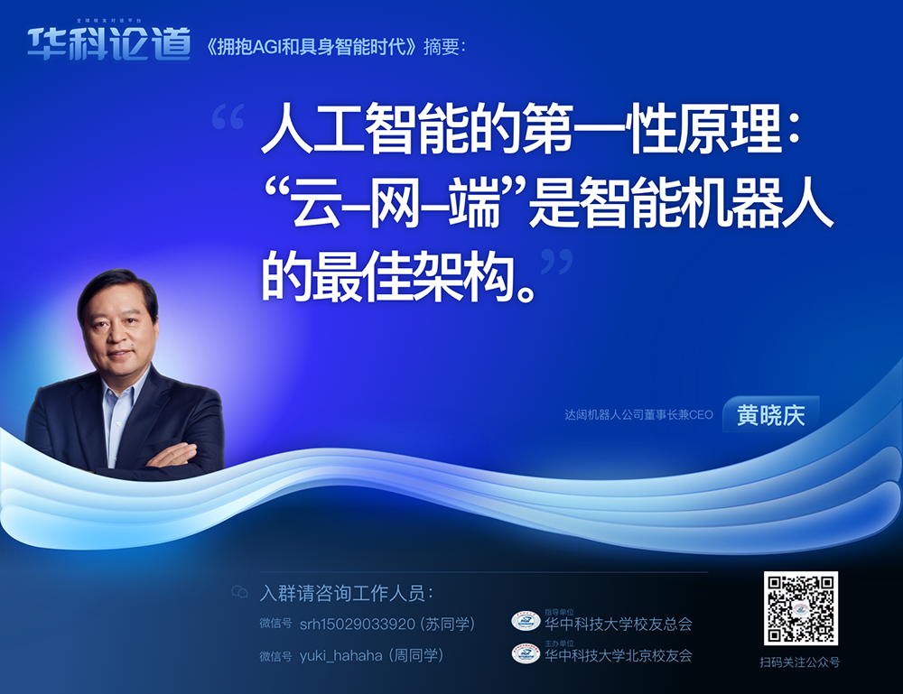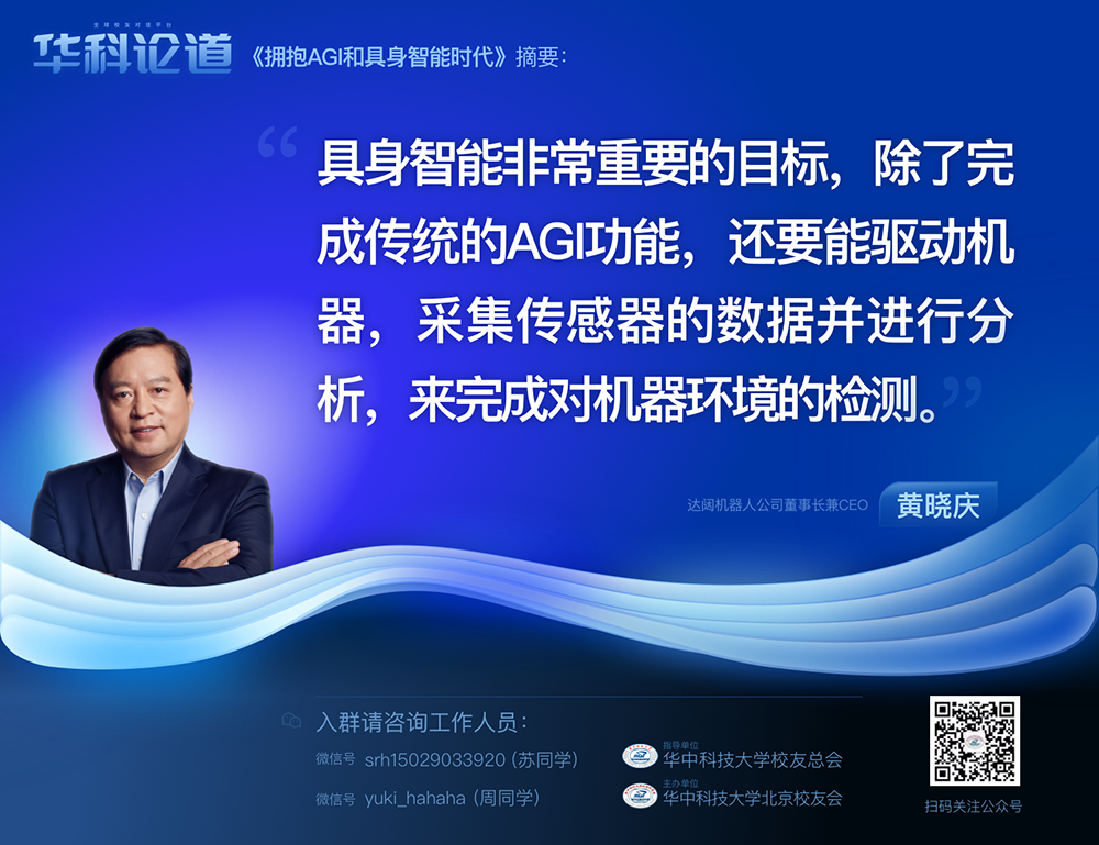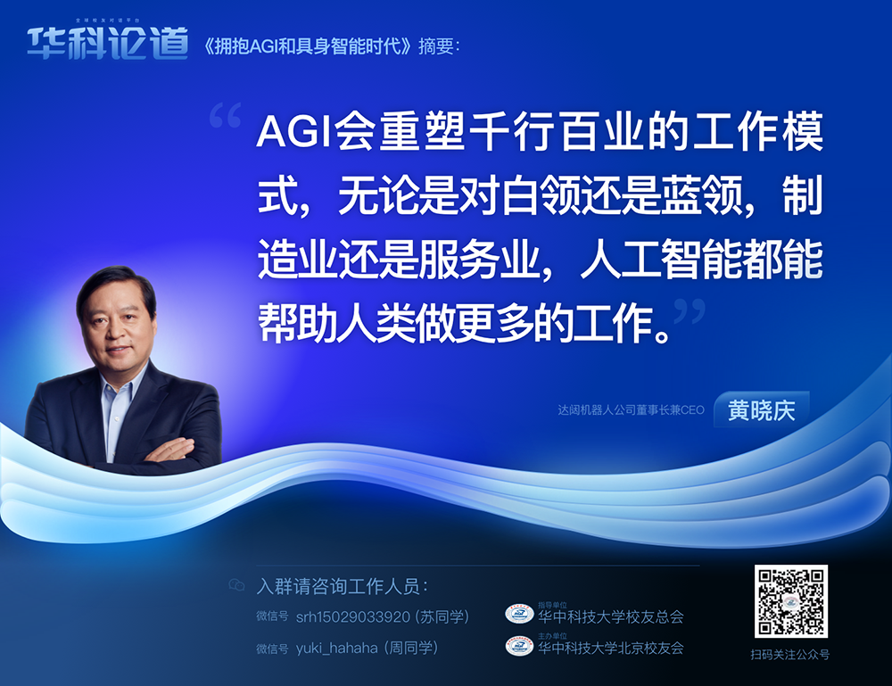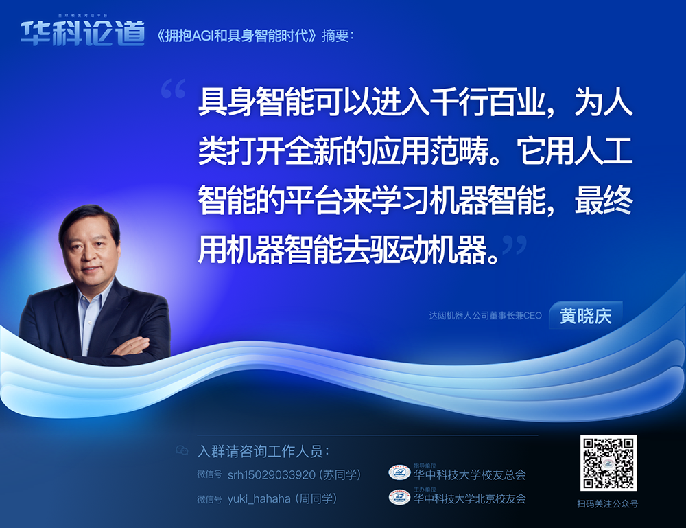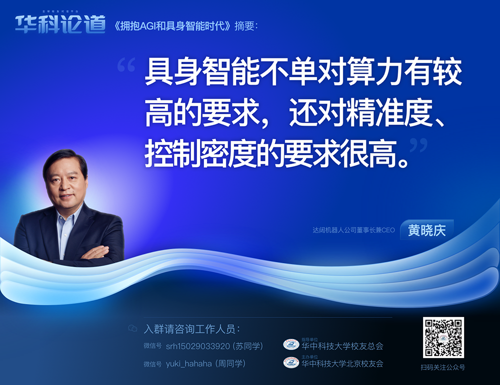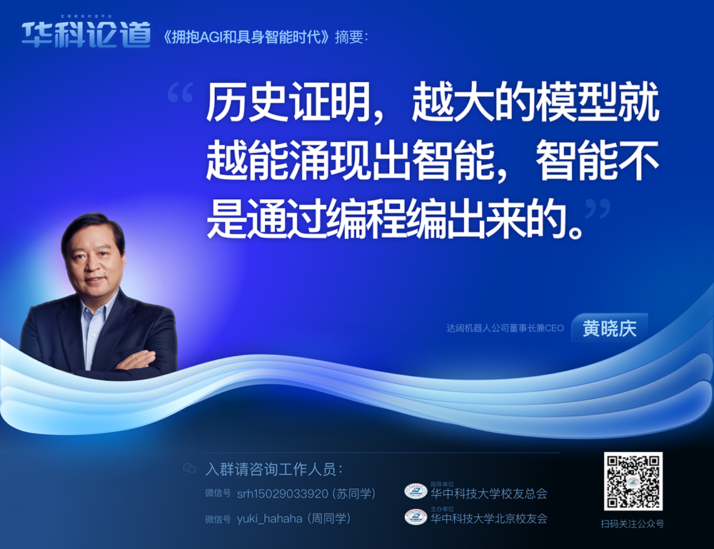1月30日,在第五十五期“华科论道”上,由华中科技大学北京校友会主办的活动迎来了一位特别嘉宾——mile米乐机器人公司董事长兼CEO黄晓庆先生,他带来了“拥抱AGI和具身智能时代”的主题演讲,为广大校友带来了精彩纷呈的分享。